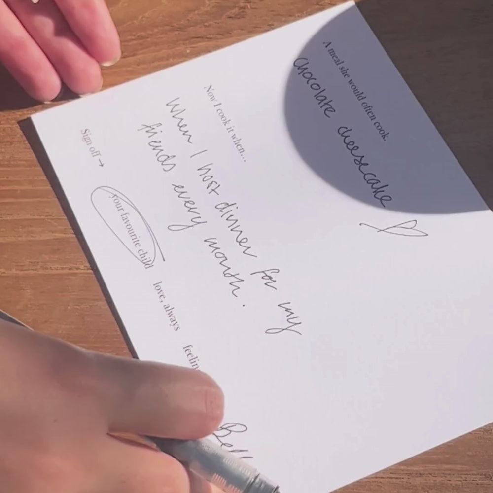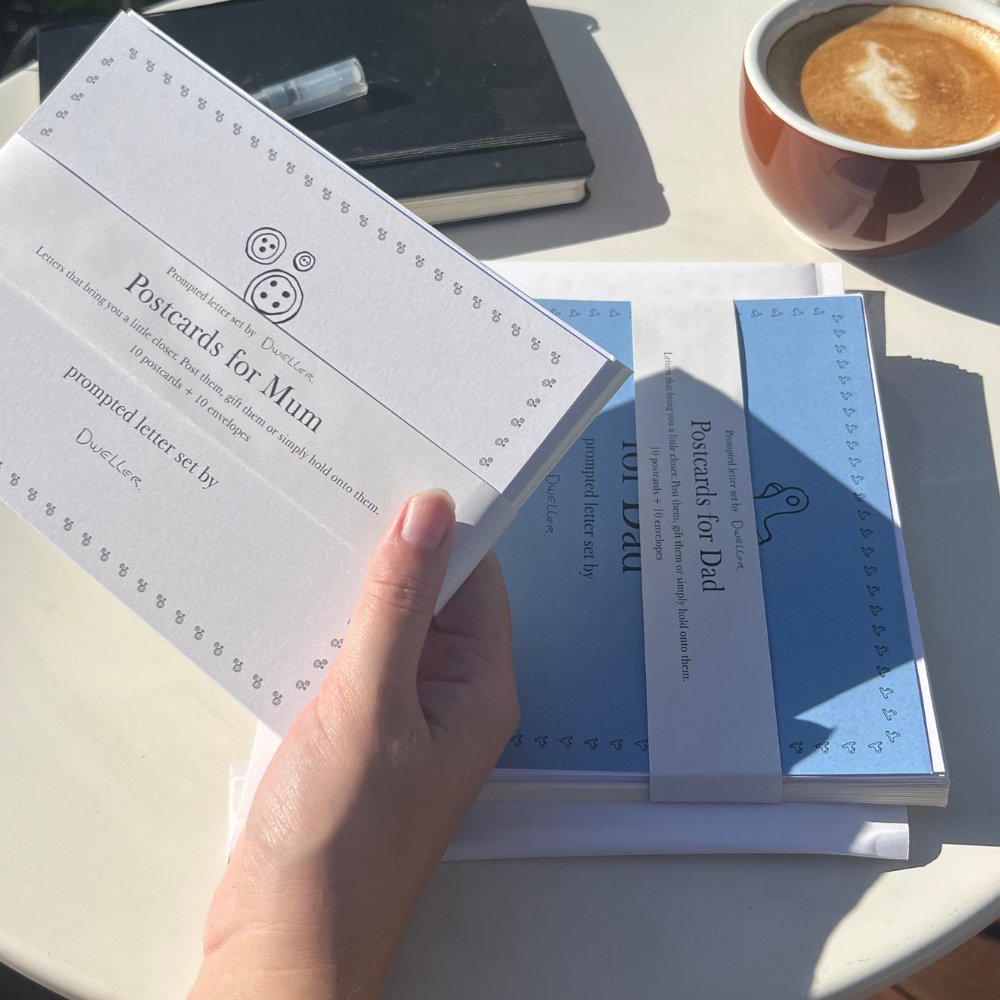 A pair of prompted postcard sets — one for Mum, one for Dad — designed to help you share the stories that matter most. Each card guides you through small reflections and memories that become something tangible: your words, in your handwriting, sent with intention. Because sometimes, the simplest way to say it is to write it.